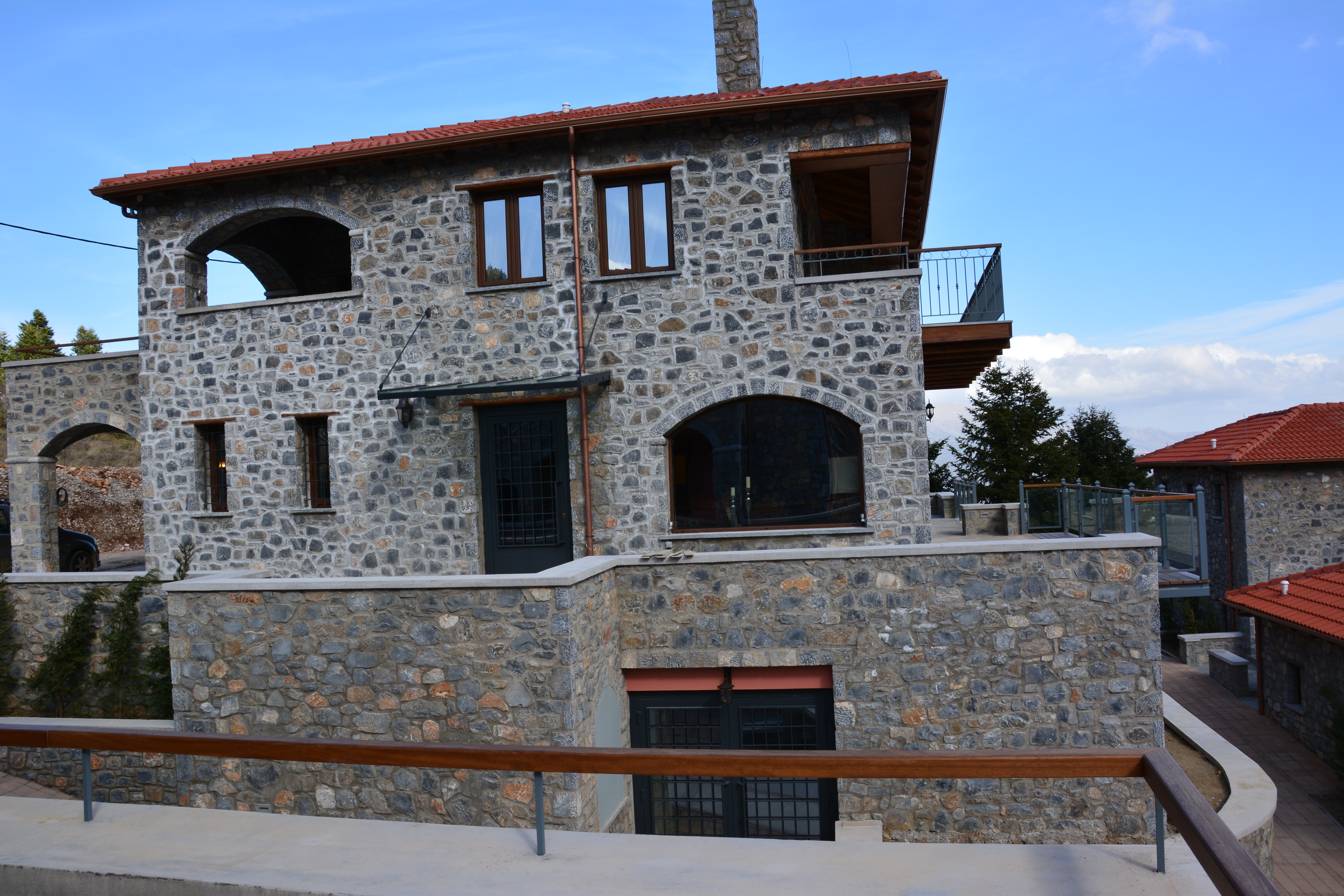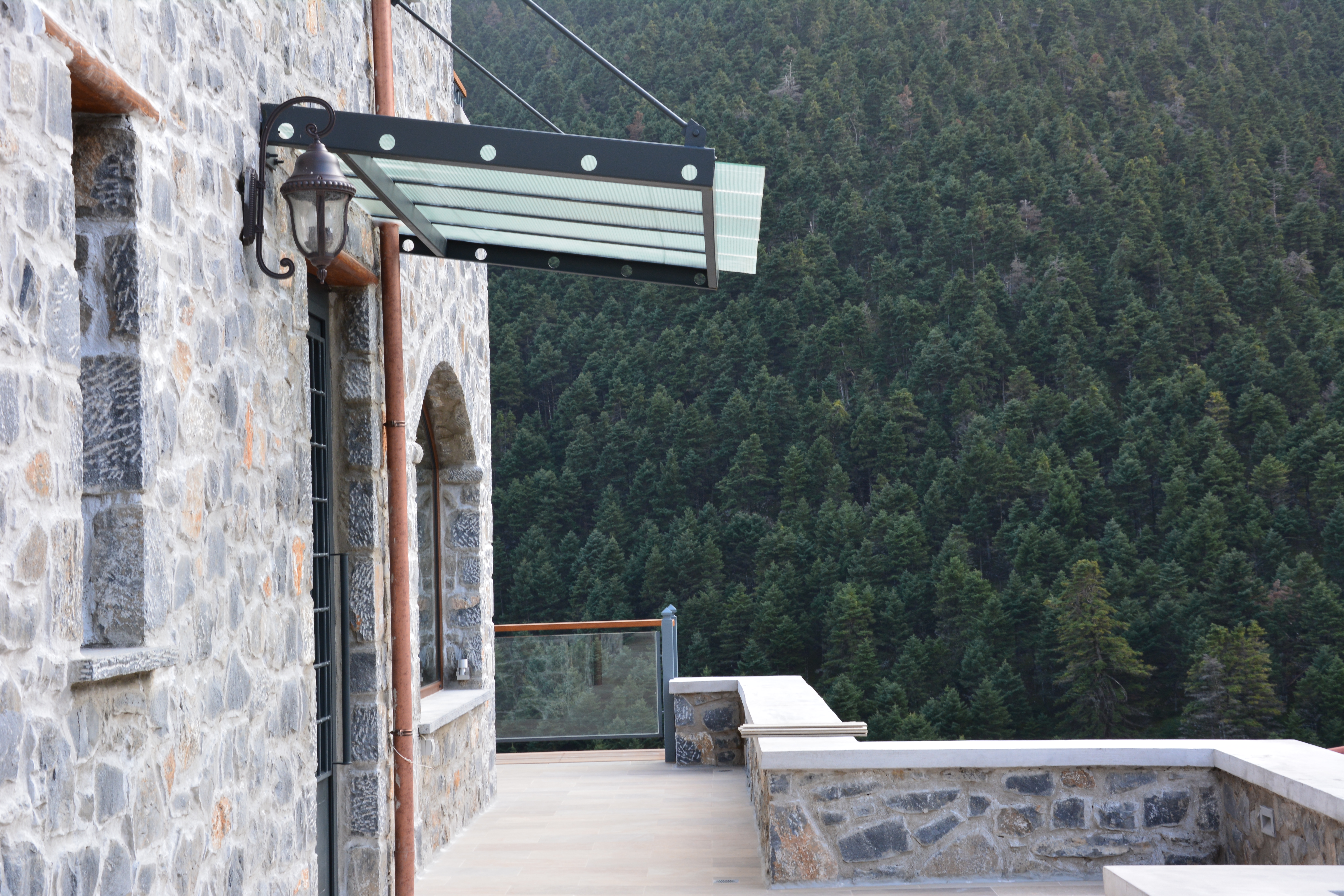 Κατασκευή και τοποθέτηση μεταλλικού στεγάστρου στο ξενοδοχείο Νεφέλες στον Καρδαρά - Αρκαδίας με πλαίσιο από λαμαρίνα και εσωτερικά χωρίσματα από ταφ καθώς και τοποθέτηση τζάμι αρμέ.
